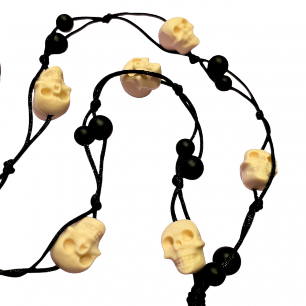 AVAINKAULANAUHA PÄÄKALLOILLAPyöreät helmet ovat silikonia, pääkallot akryylihelmiä.Niskassa on muovi..